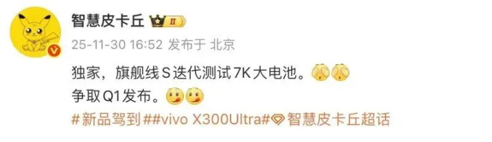 另外,博主@智慧皮卡丘 最近的一份爆料中显示,“旗舰线S迭代测试7K大电池。争取Q1发布。”