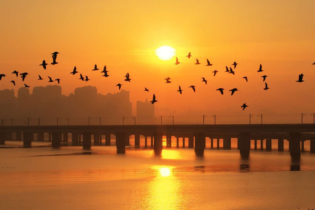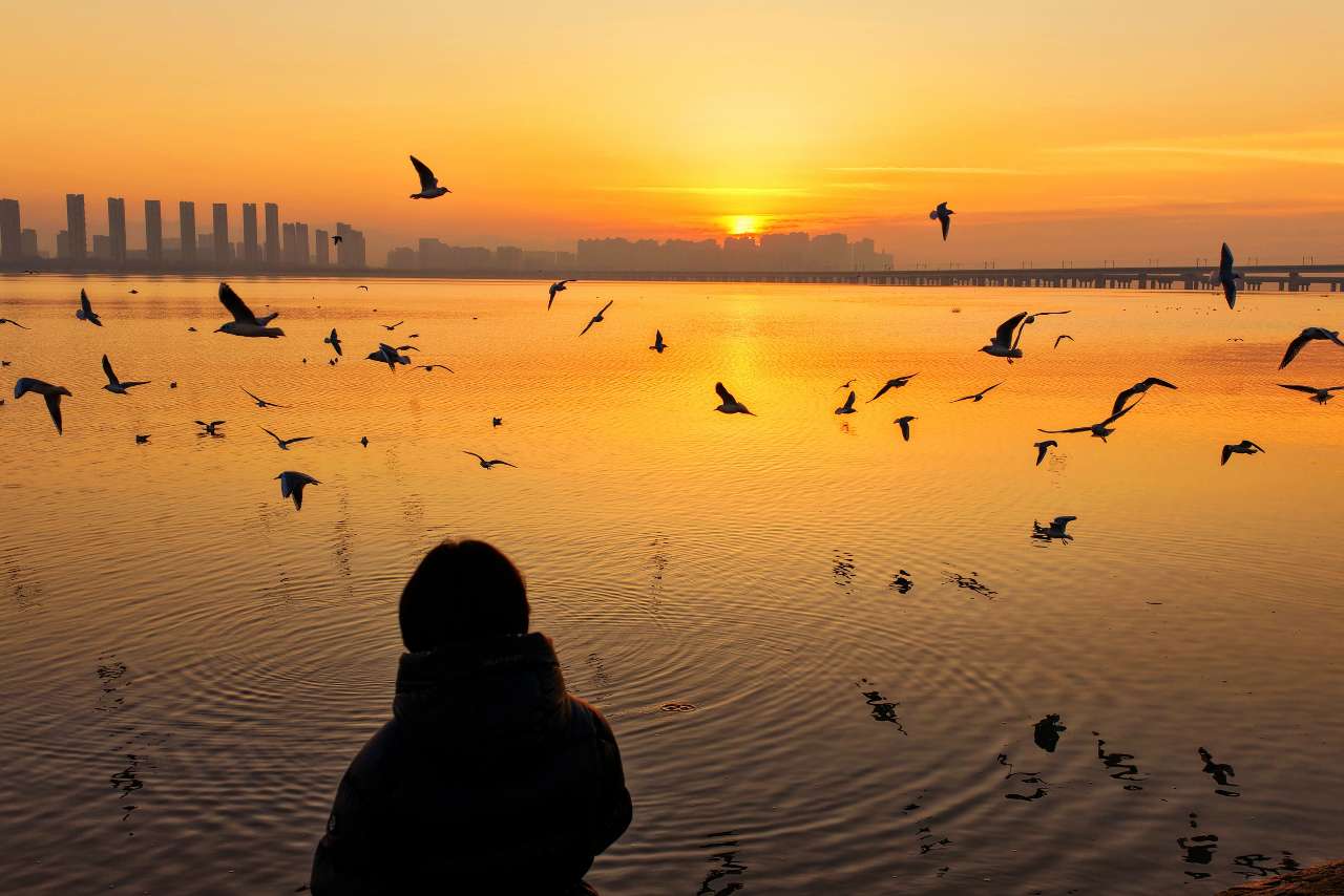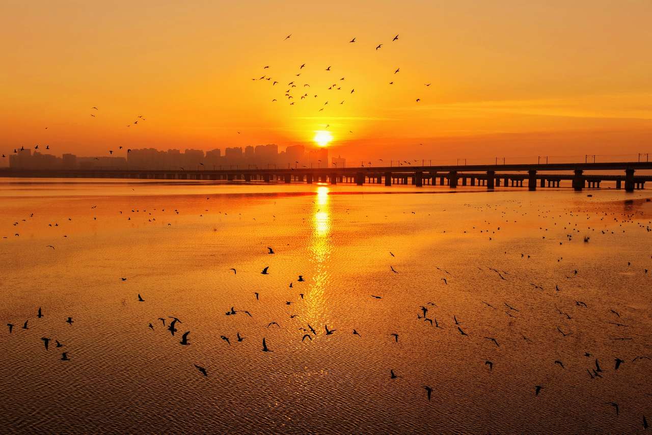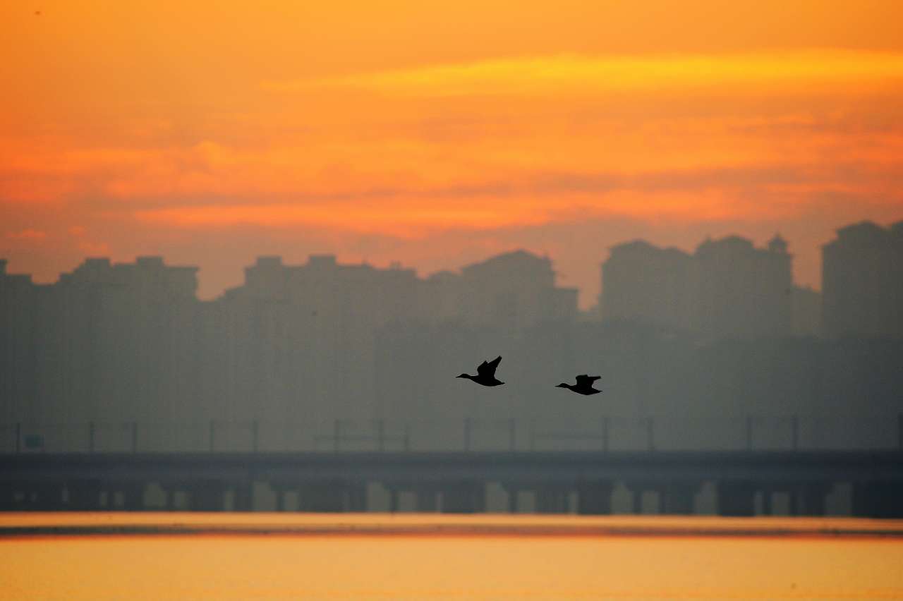 冬日清晨,山东省青岛市城阳区红岛街道沿海湿地霞光初映、万鸟翔集,绘就一幅美丽的生态画卷。