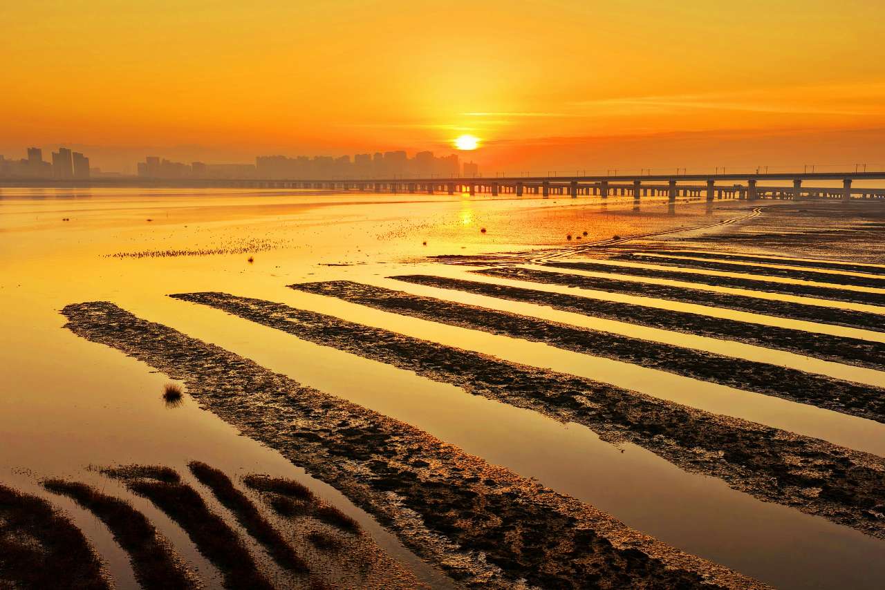 12月24日,冬日霞光在山东省青岛市城阳区红岛街道沿海湿地绘就美丽画卷。
