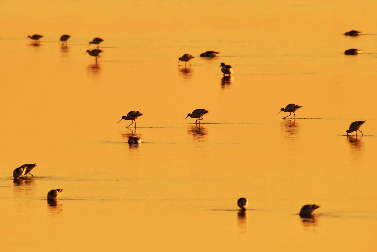 12月24日,成群反嘴鹬在山东省青岛市城阳区红岛街道沿海湿地觅食。