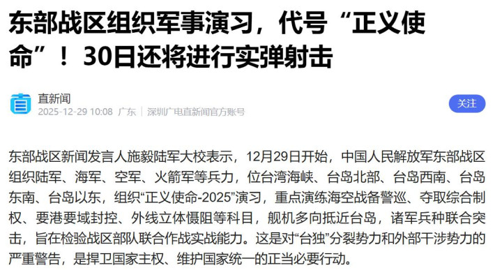 直新闻 《东部战区组织军事演习,代号“正义使命”!30日还将进行实弹射击》2025-12-29