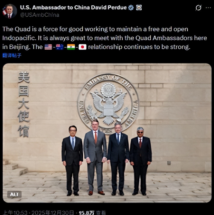 2025年12月30日,美国驻华大使庞德伟在北京将日本,澳大利亚,印度三个国家的驻华大使都给请了过来,四个人关起门来开了一个“四方安全对话”大使级别的会议。