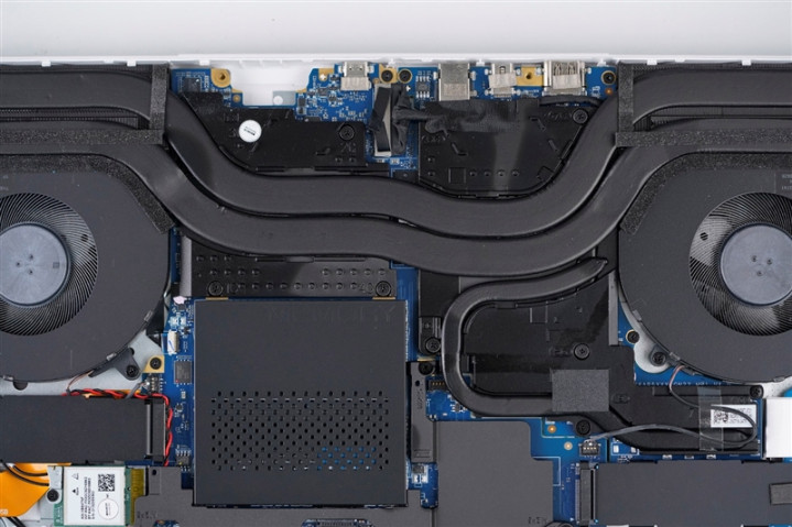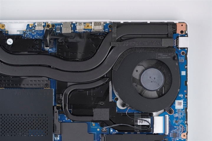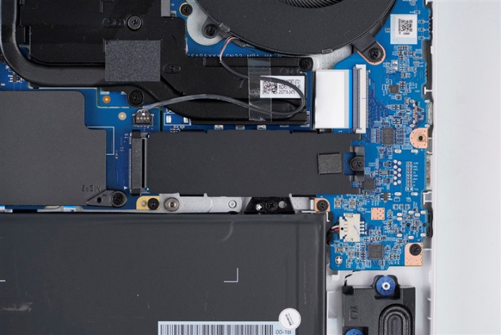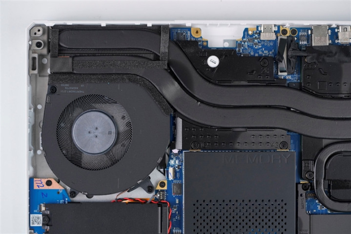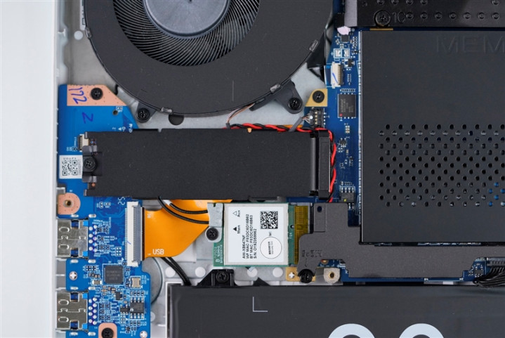 雷神猎刃S游戏本两枚涡轮风扇下方的M.2 SSD安装位置,自带黑色散热片,其中左侧位置预装了一个来自长江存储的PC411 1024GB SSD。