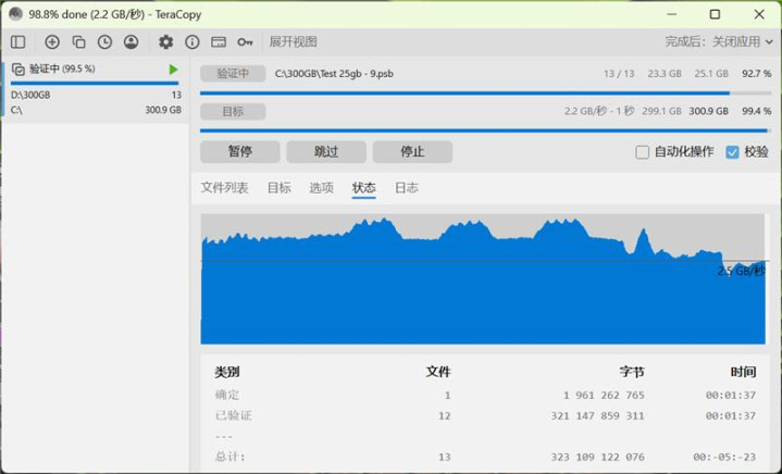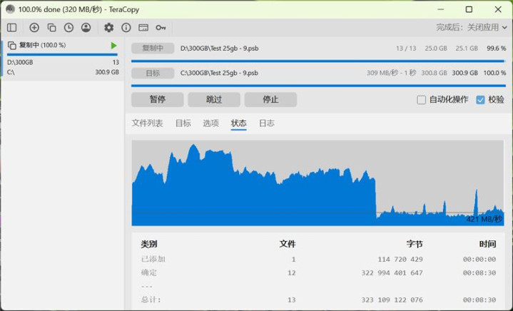 可以看到长江存储PC411 SSD在写入300GB数据时,前200GB写入速度可以保持在2.6GB/s,之后智能缓存耗尽,写入速度降低至400MB/s左右。在校验过程中,读取速度可以始终保持在3GB/s左右,只在最后阶段略有下降。