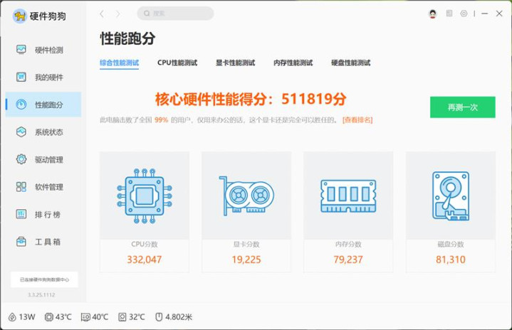 在硬件狗狗测试中,核心硬件得分为511819,CPU分数为332047。