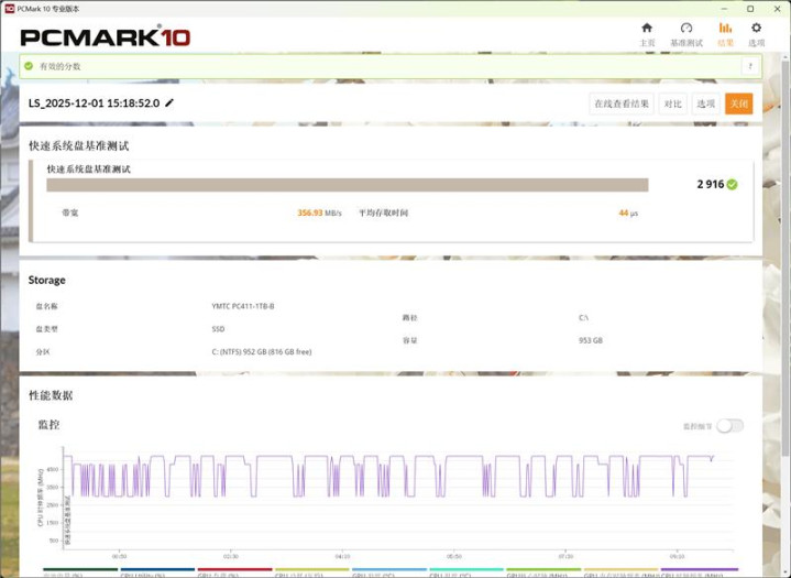 PCMark 10中的快速系统盘基准测试跑出了2916分的好成绩,带宽约356MB/s,平均存取时间仅为44微秒。
