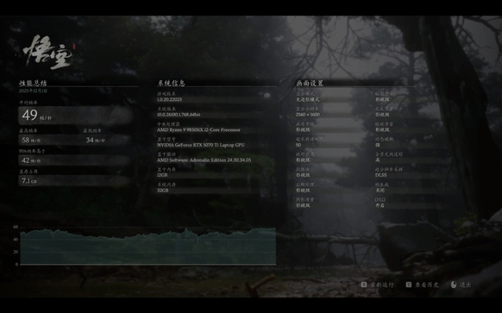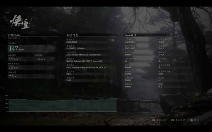 在《黑神话·悟空》中,使用影视级画质预设,DLSS采样精度设置为50,记录2K分辨率时的游戏帧数。