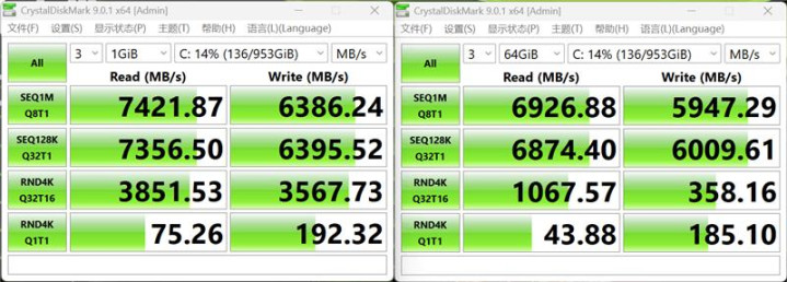 1GB下测试读取速度超过7.4GB/s,写入也超过了6.3GB/s,64GB测试时略有下降。