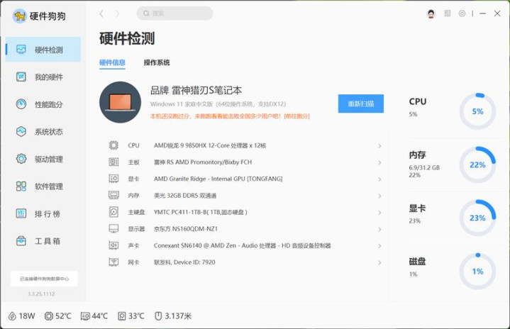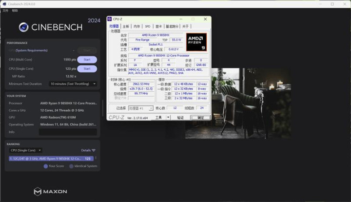 我们拿到的这台雷神猎刃S游戏本搭载了AMD锐龙9 9850HX处理器,基于Zen5架构,4nm工艺,12核心24线程,最高频率高达5.2GHz,默认TDP为55W,还内建AMD Radeon 610M显示核心。