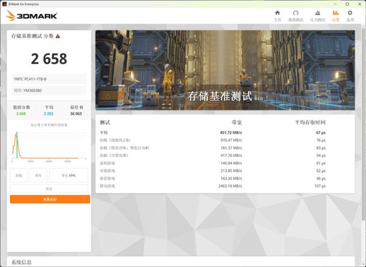3Dmark中存储基准测试跑分得到了2658,移动游戏时带宽可以达到2463MB/s。