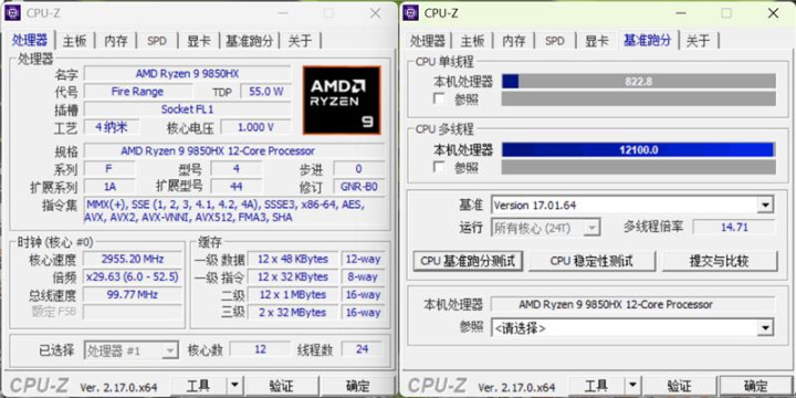雷神猎刃S游戏本搭载AMD锐龙9 9850HX处理器,在CPU-Z基准测试中,多线程成绩为12100.0,单线程成绩为822.8。