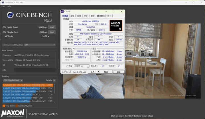 三、CPU性能测试:55W的AMD锐龙9 9850HX能效一流