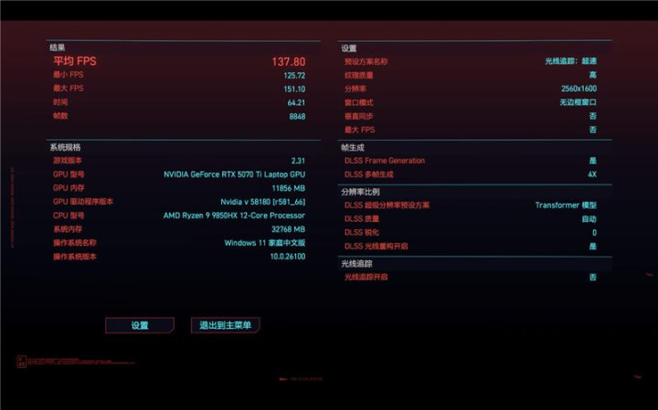 《赛博朋克:2077》在开启DLSS 4最高的4X级别多帧生成时,在2K分辨率下的测试帧率从41.59提高到137.80。