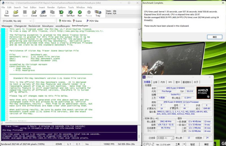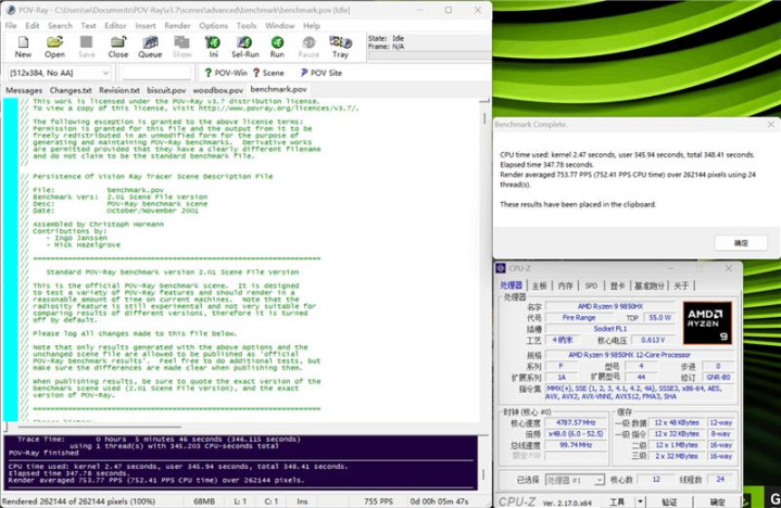 POV-Ray测试中,单核成绩为753.77pps,多核成绩为9838.39pps。