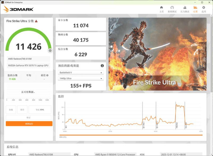 雷神猎刃S游戏本搭载的NVIDIA GeForce RTX 5070Ti Laptop显卡,在3Dmark的Time Spy测试中,显卡分数分别为17350和8313。