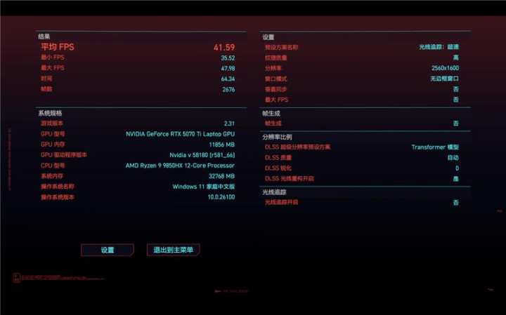 在《赛博朋克:2077》中,使用最高画质预设和DLSS帧生成,记录2K分辨率时的游戏帧数。