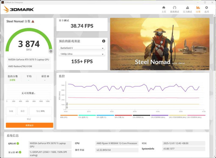 在3Dmark的Steel Nomad测试中,总成绩为3874,显卡测试成绩为38.74fps。