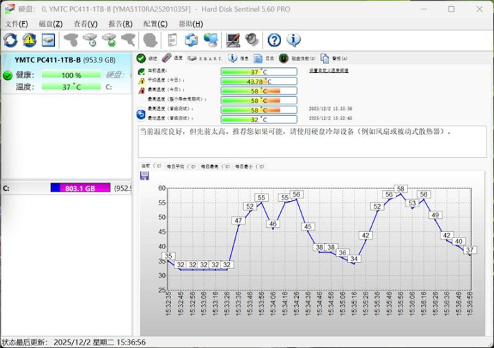 在室温26度的环境下,长江存储PC411 1TB SSD在雷神猎刃S游戏本内,仅使用被动散热片,就可以很好的控制住发热,待机时温度仅有32度,高强度写入测试时最高温度也只有58度,而且在写入结束之后很快就能降温至待机水平,温度控制极佳。