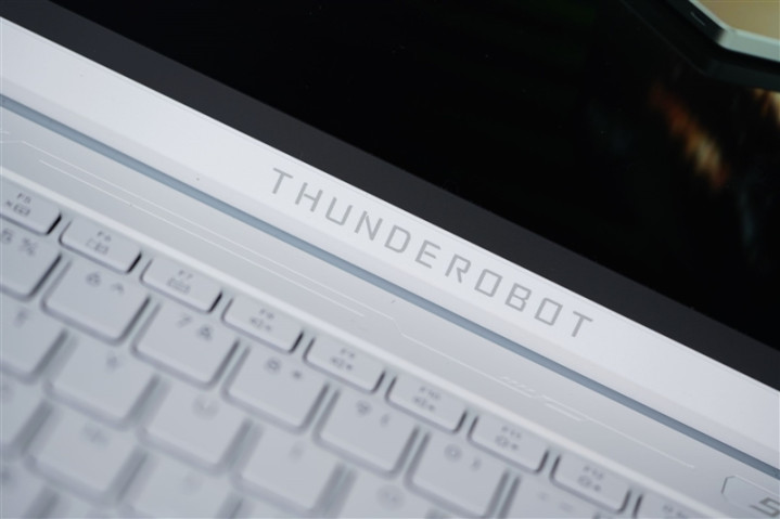 屏幕下方的白色转轴部分印有雷神的品牌名称。
