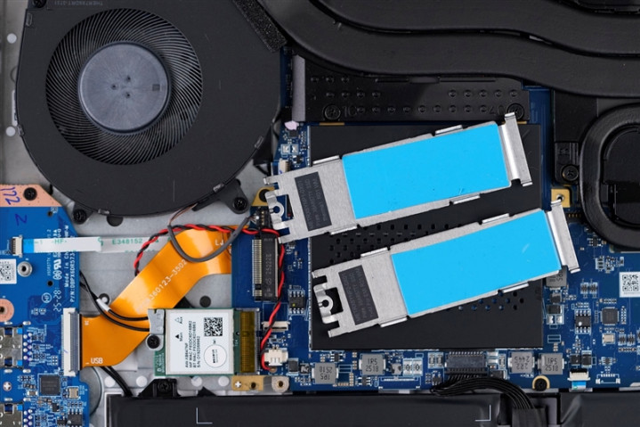 取下两侧的SSD散热片,可以看到散热片内部贴有蓝色的导热硅胶。