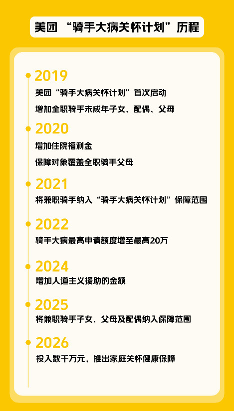2月6日,美团官方宣布将于2月10日起升级“骑手大病关怀计划”,由平台出资,免费为全国超百万稳定跑单的骑手及其家庭成员(包含父母、配偶以及子女)新增住院诊疗补充医疗保障。